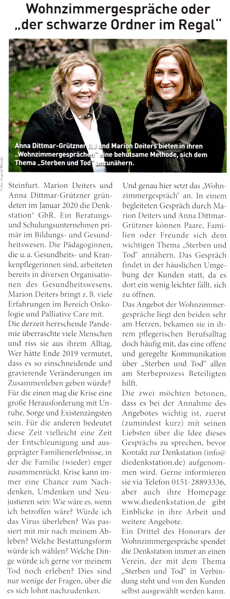 Publikationen zum Leben, Sterben und Tod Trauerkultur Hoch 3 (2025):Kultursensibler Umgang mit Trauer in Unternehmen – Kultursensibler Umgang mit Trauerritualen Praxisanleiter Akademie (2025): Der (nahende) Tod als Lernsituation Praxisanleiter Akademie (2023): Die kultursensible Palliativversorgung Kita Akademie (2023) : Tod und Sterben kindgerecht thematisieren TP (2022): Mit dem Tod leben pflegen: palliativ (2021): „Niemals geht man so ganz…“ pflegen: palliativ (2020) „Beim Sterben gibt es keine zweite Chance“ Der Steinfurter (2020): Wohnzimmergespräche oder „der schwarze Ordner im Regal“